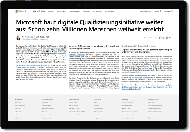 2020 startete Microsoft eine weltweite Initiative für digitale Qualifizierung. Das Programm hat weltweit bereits mehr als 30 Millionen Menschen den Erwerb digitaler Kompetenzen ermöglicht. Die Microsoft-Initiative richtet sich an alle, die sich für die Anforderungen der digitalen Arbeitswelt qualifizieren wollen und den Einstieg in zukunftssichere Berufe anstreben. In Deutschland wird das Qualifizierungsprogramm im Rahmen der Bildungsinitiative IT-Fitness vom Förderverein für Jugend und Sozialarbeit e. V. umgesetzt.
